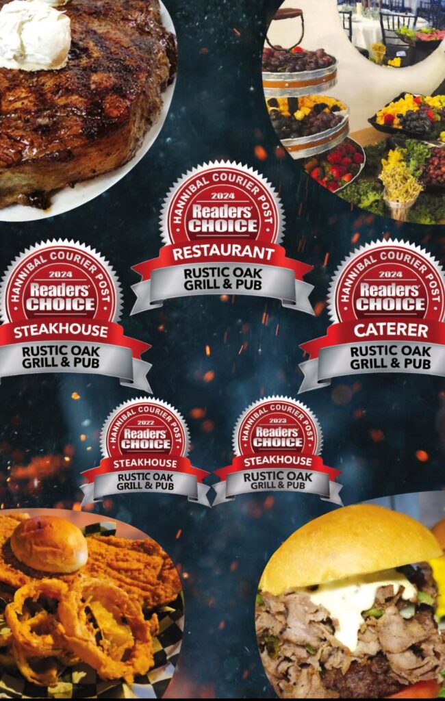 Voted Peoples Choice for Best Steak House in Hannibal for 2022 and 2023. Enjoy a rustic casual atmosphere, with great food and drinks to please all palates and budgets. Dine in, take out, or even have us cater your special event! Try Aged Angus upper 2/3rd choice steaks, hand breaded pork tenderloins, freshly breaded catfish, pasta, and much more! Come in for a large variety of desserts, such as pies, cobblers, cakes, and fudge - not to mention our “Cheesecake Factory” Cheesecakes! Also enjoy our sister restaurant at the Mark Twain Lake, “Rustic Oak Cabin Steakhouse”.
