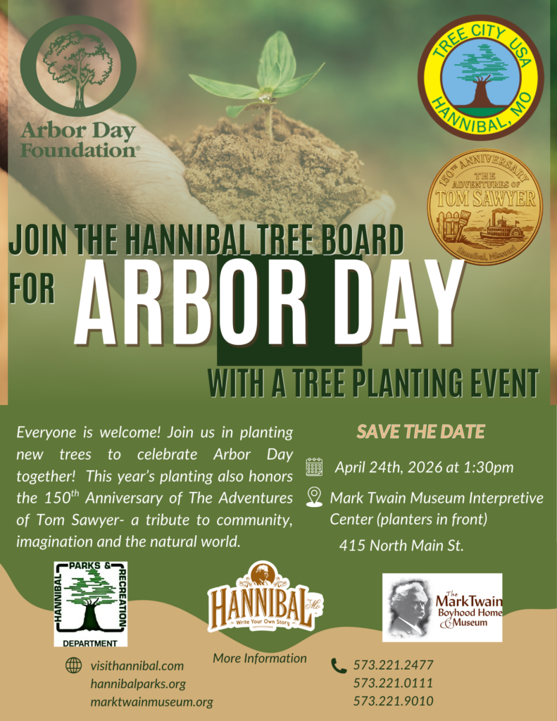 Join us in planting new trees to celebrate Arbor Day together! This year's planting also honors the 150th Anniversary of the Adventures of Tom Sawyer - a tribute to community, imagination and the natural world. Sponsored by Hannibal Parks and Recreation, Hannibal Tree Board, Hannibal Convention and Visitors Bureau, the Mark Twain Boyhood Home and Museum and the Arbor Day Foundation. Tom and Becky will be there too!