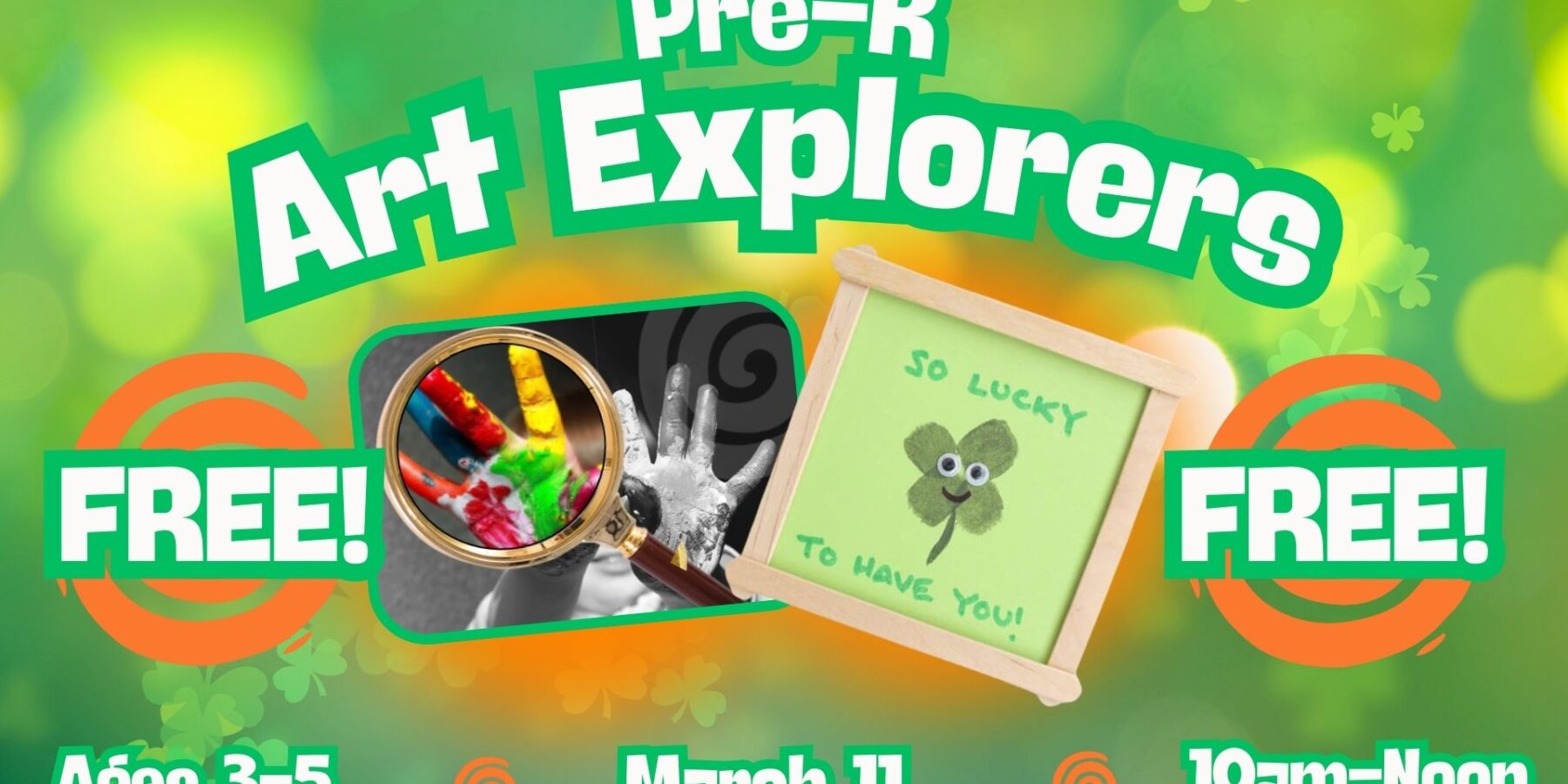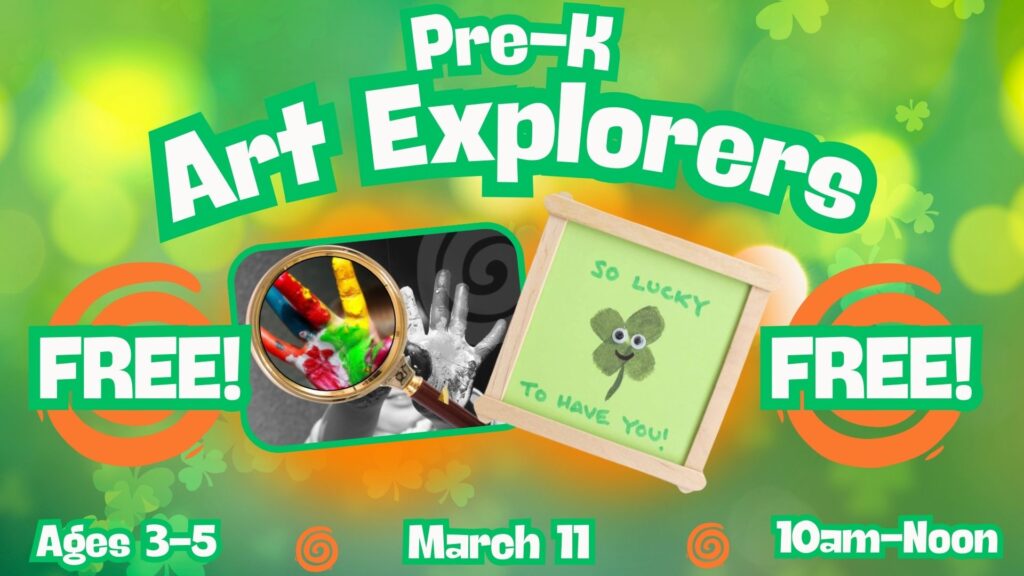 The March activity features a St. Patrick’s Day themed project, perfect for little artists eager to explore color, creativity and fun. Pre-schoolers and their caregivers will work together using simple, kid-friendly materials. The activity this month will be a fun craft stick framed shamrock finger painting, featuring googly eyes and a festive message. Children are never too young to experience the arts. Through creative play, young participants build confidence, develop fine motor skills, strengthen communication and observation skills and spark imagination and self-expression.