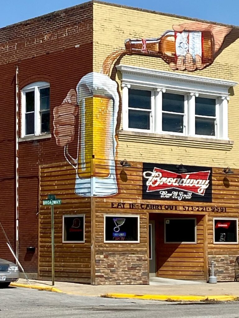 * The Broadway Bar and Grill has a dramatic giant hand pouring a nice cold Budweiser down the side of the building and into a tall, frosty mug. This mural definitely reflects a place to grab a burger and a drink!