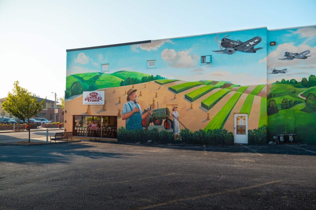 * A farmer stands proudly next to his tractor among his freshly plowed fields and hay stacks in this mural that recognizes the contribution of agriculture to our local industry.