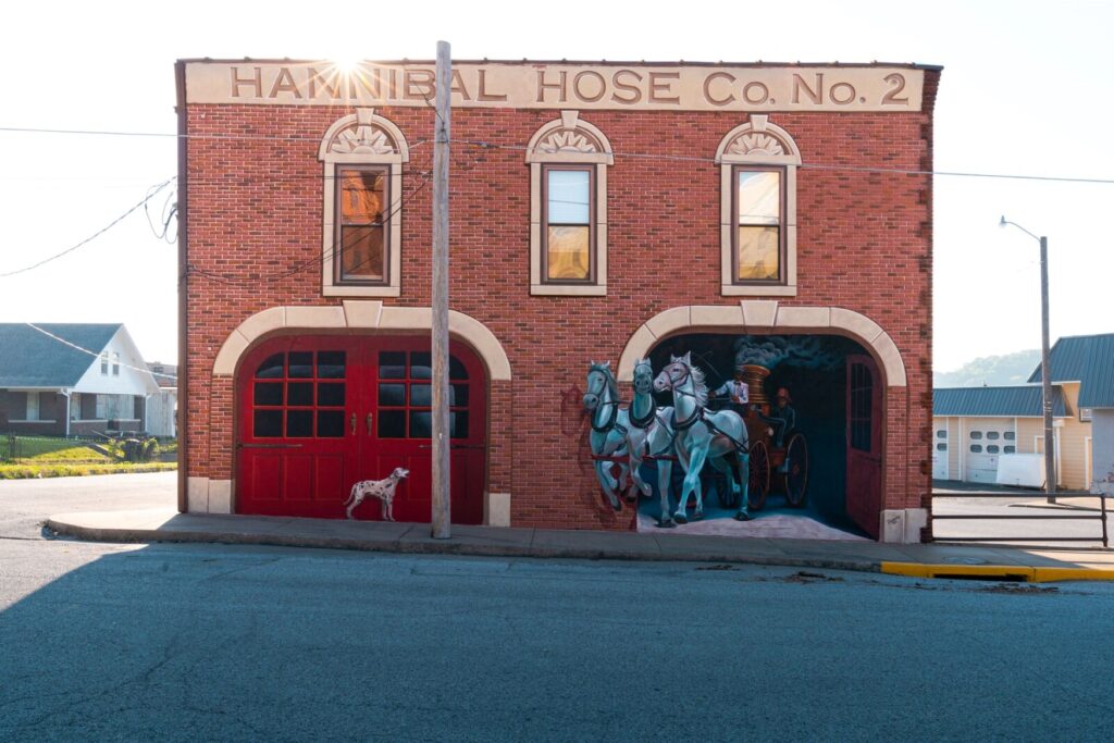* The site of the old Hannibal Fire Station is home to one of the locals’ favorite murals. Three white horses are charging out of the station on the way to a fire as the engine company’s Dalmatian looks on.