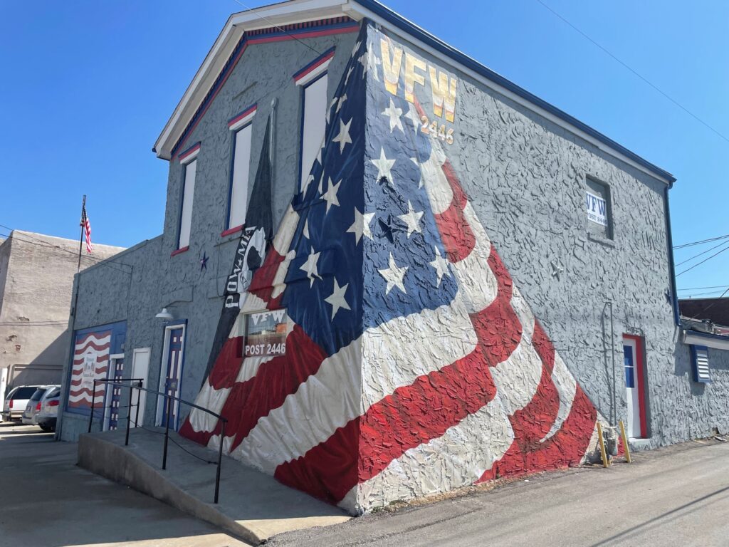 * A giant-size Old Glory waves proudly on the VFW Hall, in recognition of the men and women who have served our country.