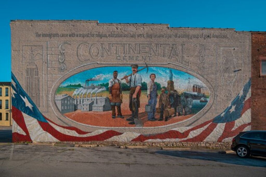 * The early years of a still-thriving local industry, Continental Cement, is shown in this dramatic mural. Continental Cement supplied projects including the Hoover Dam, the Empire State Building, and the Panama Canal.