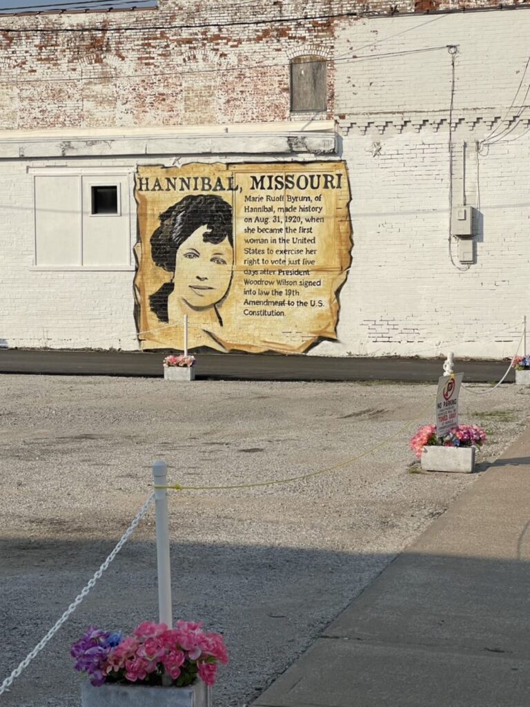 * Hannibal is most famous for Mark Twain, but many other notable people have lived here. This mural features Hannibalians of note, including Mary Ruoff Byrum, the first woman to cast a vote in an election for a candidate in the United States after the ratification of the 19th Amendment, Baseball Hall of Famer Jake Beckley, and Ukulele Ike, the voice of Jiminy Cricket.