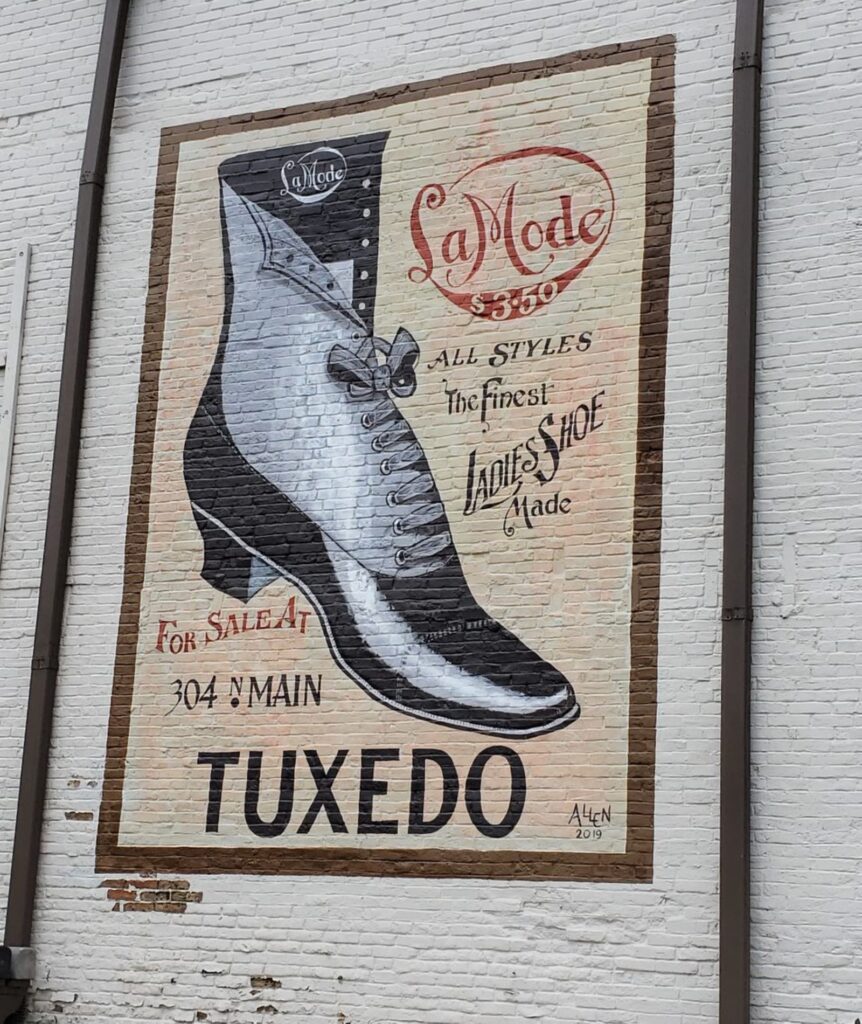 308 N. Main Ladies Shoe Ghost Sign (a Ghost Sign is a reproduced advertisement for a business that was once located in a town. Buildings in the 19th century were often painted with advertisements.)