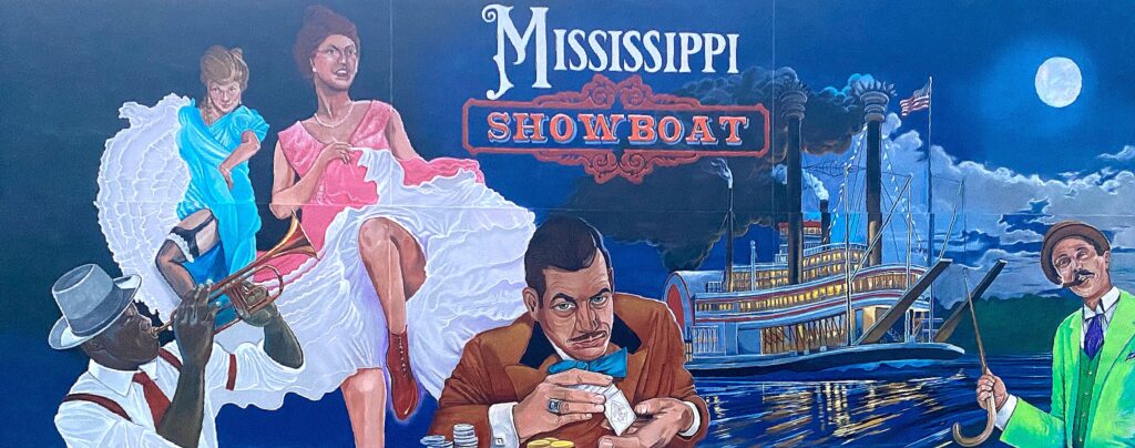 * This mural takes you back to the exciting days of steamboat entertainment.
