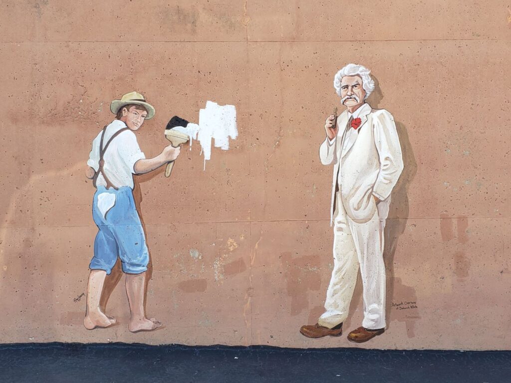 * This painting is a whimsical look at Mark Twain standing alongside his most famous character, Tom Sawyer. Notice the mischievous look on Tom’s face. And it doesn’t look like Twain disapproves of his shenanigans.